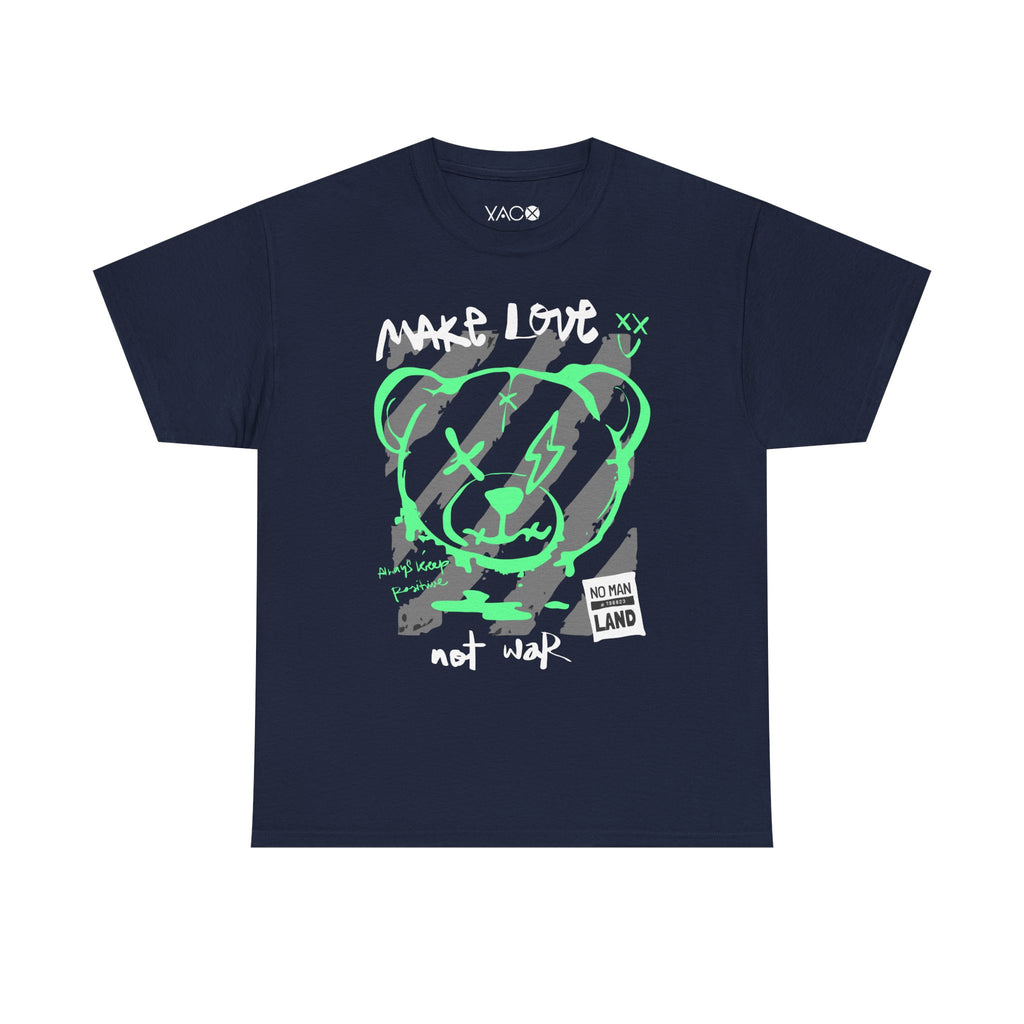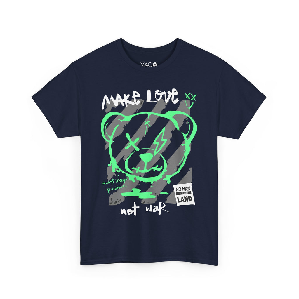 Bring a bold urban vibe to your style with this unique artwork that blends neon colors and powerful messages. The design features a graffiti-style bear in glowing green with grey and white details, surrounded by inspiring words like “Make Love Not War” and “Always Keep Positive.”
